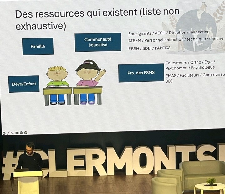 Cette année, l’EMAS 63 a également eu le plaisir de vivre une journée de partage grâce au séminaire du Dispositif de Réussite Educative (DRE) de la Ville de Clermont-Ferrand. Le Séminaire Dispositif Réussite Éducative a en effet été l’occasion pour notre équipe de participer à une table ronde très riche à propos des conditions, enjeux et perspectives pour l’éducation inclusive à l’échelle de la vie de la cité, ainsi qu’à des ateliers ciblant des pratiques, des approches, des publics spécifiques ou encore des postures collaboratives particulières. Nous avons également pu présenter comment la démarche de Communication Alternative et Améliorée (CAA) dans des établissements scolaires peut être au service d’un soutien aux compétences psychosociales se voulant le plus inclusif possible. Un grand merci à Monsieur Si Mohammed Selloum qui nous a fait confiance, à l’association de Prévention en Orthophonie du Puy-de-Dôme (OP 63) qui nous a mis en lien et à la municipalité pour son accueil chaleureux. Intéressé par nos contenus? Contactez-nous et nous vous transmettrons nos ressources en CAA et pourrons vous mettre en lien avec le DRE.