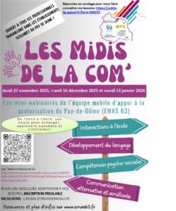 - Venez découvrir les « Midis de la Com' »: un nouveau format visio court et accessible pour échanger sur la communication des élèves et répondre à toutes les questions des équipes scolaires et les orienter vers les bonnes ressources. En quelques minutes, l’animatrice présente des stratégies, méthodes et réflexions en lien direct avec des situations vécues par les participants ou avec un thème spécifique illustré du champ des interactions: rendez-vous à la fin de notre livret des sensibilisations pour plus de détails. Un court sondage en ligne a été créé pour recueillir les besoins et souhaits de thèmes et de modalités pour les prochaines dates de « Midis de la Com' »: à remplir et diffuser massivement!