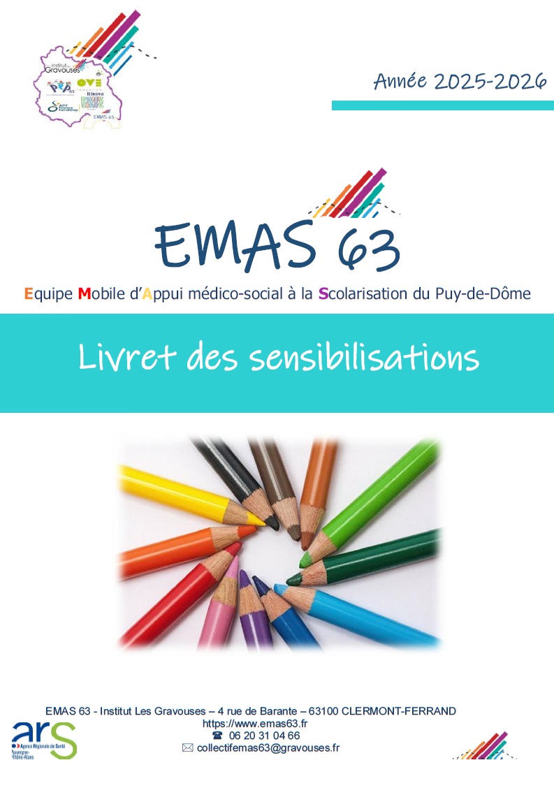 Pour permettre aux équipes des établissements scolaires de connaître les propositions de sensibilisation de l’EMAS, un livret présentant les thématiques et modalités d’intervention a été créé. En effet, au fil des interventions pratiquées au sein des établissements scolaires du département, l’EMAS 63 a eu la chance d’échanger sur l’existant et sur le chemin à parcourir tous ensemble en matière de formation des équipes, d’apports en connaissances et en techniques spécifiques, ainsi qu’en méthodologie lorsqu’il s’agit d’organiser ensemble un système éducatif accueillant toutes les différences.