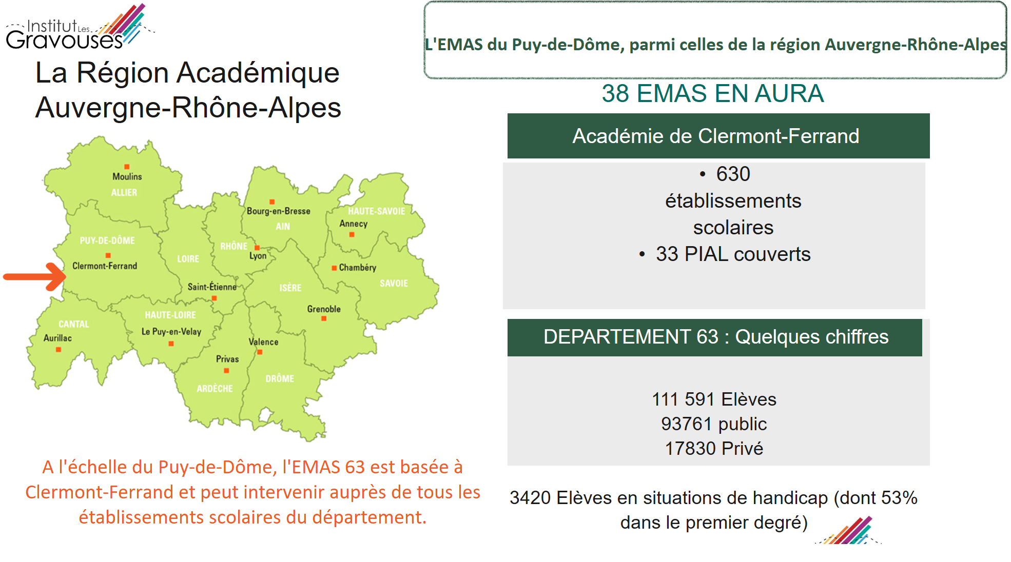 L’EMAS 63 est installée à Clermont-Ferrand et se déplace dans tout le département du Puy-de-Dôme. Les professionnelles de l’équipe principale peuvent aller dans tous les établissements scolaires du Puy-de-Dôme.